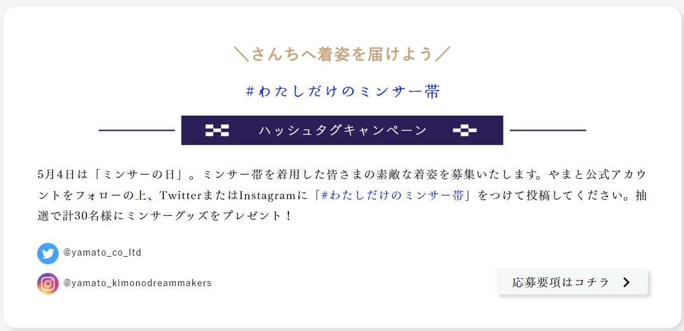 やまと公式TwitterまたはInstagramをフォローして、ミンサー帯を着用した写真を「#わたしだけのミンサー帯」のハッシュタグを付けてに投稿していただいた方に、抽選で30名にミンサーグッズをプレゼントいたします。