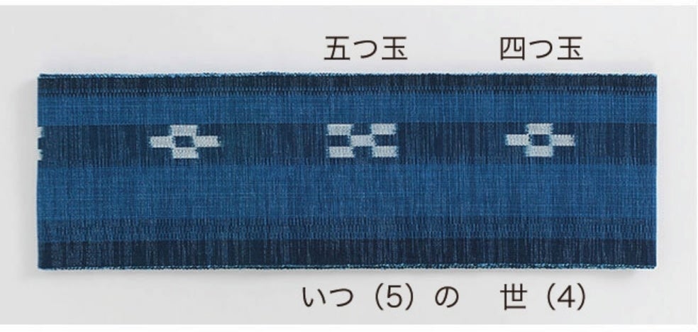 ミンサーとは「綿(ミン)で織られた幅の狭(サー)い帯」を意味します。ミンサー帯は、最も素朴な五つ玉と四つ玉の絣を組み合わせて「いつの世」の模様として、島の娘たちが「いつの世までも末永く仲睦まじく」と想いを込めて愛しい人に送った帯だと伝えられています。