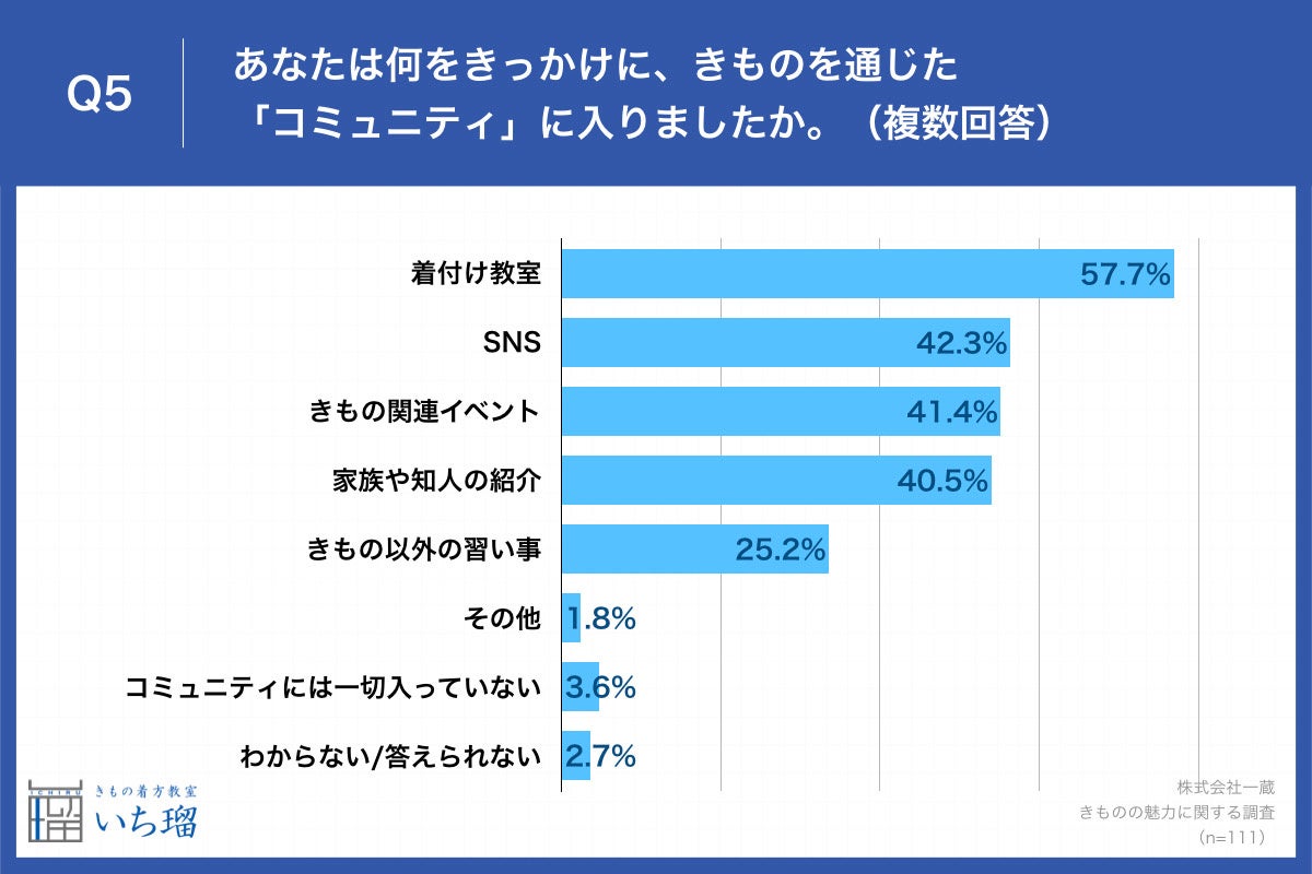 「Q5.あなたは何をきっかけに、きものを通じた「コミュニティ」に入りましたか。(複数回答)」と質問したところ、「着付け教室」が57.7%、「SNS」が42.3%、「きもの関連イベント」が41.4%という回答となりました。
