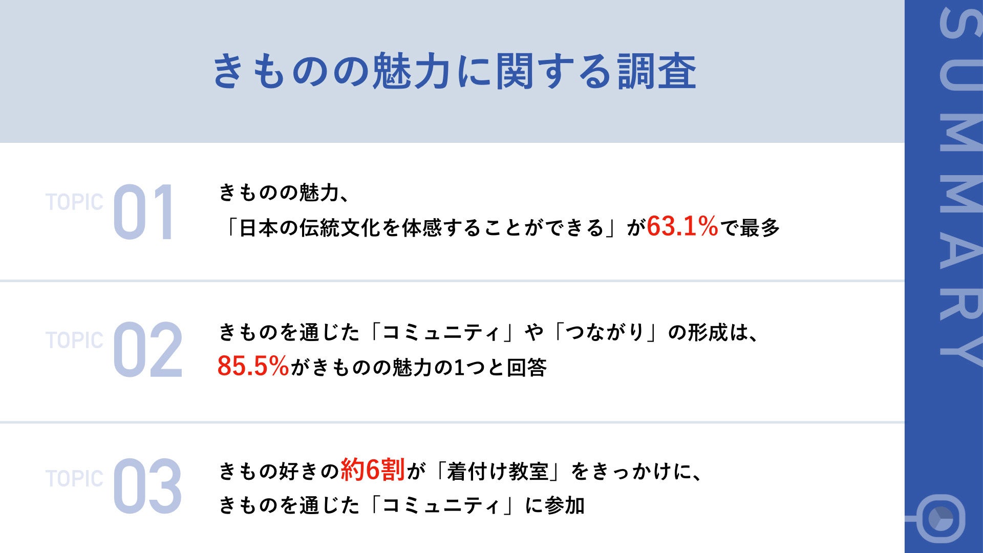 コロナ対策緩和により少しずつ日常が戻りつつあり、出かける機会も増えてきています。今回の調査において、約9割からきものの魅力の一つとして「きものコミュニティ」があるという声が挙がりましたが、約6割が着付け教室をきっかけにコミュニティに参加していることからも、着付け教室は、ただきものに関する知識を学べるだけでなく、きものを通した文化の理解やコミュニティの形成にも繋がるかもしれません。