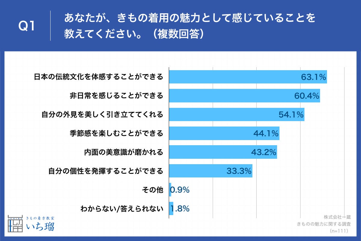 きもの着方教室 いち瑠(https://ichiru.net/)を展開する株式会社一蔵(本社:東京都千代田区、代表取締役社長:河端義彦)は、きもの着用を趣味にしており、1年に数回以上きものを着用している女性111名に対し、「きものの魅力」に関する調査を実施いたしました。(PRTIMES)