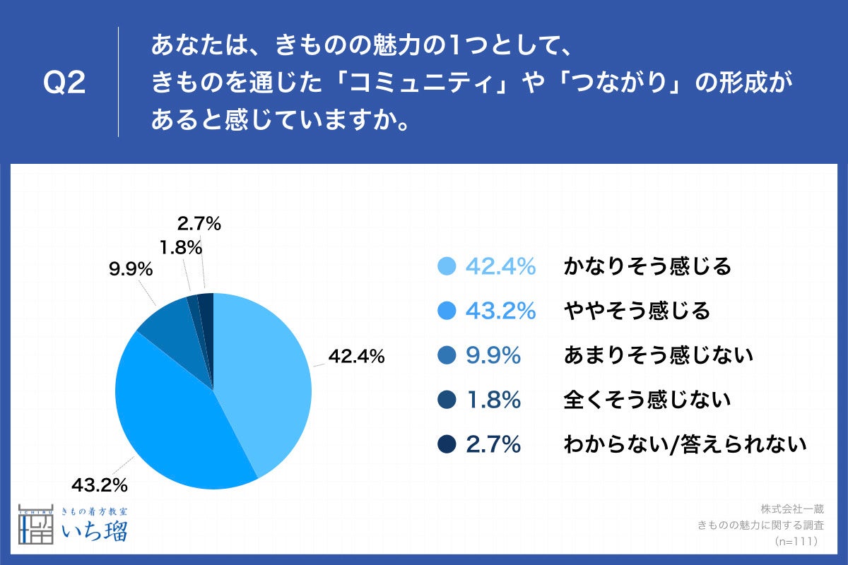 「Q2.あなたは、きものの魅力の1つとして、きものを通じた「コミュニティ」や「つながり」の形成があると感じていますか。」と質問したところ、「かなりそう感じる」が42.4%、「ややそう感じる」が43.2%という回答となりました。