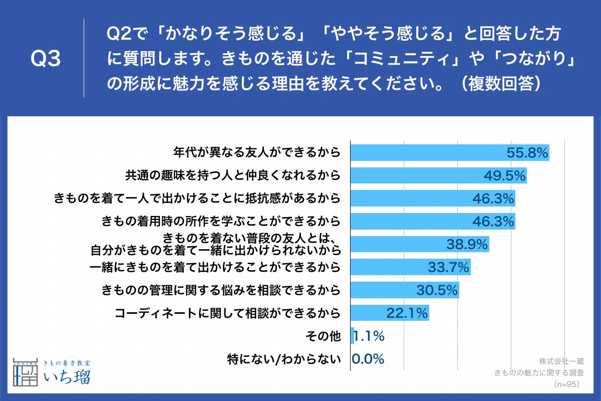Q2で「かなりそう感じる」「ややそう感じる」と回答した方に、「Q3.きものを通じた「コミュニティ」や「つながり」の形成に魅力を感じる理由を教えてください。(複数回答)」と質問したところ、「年代が異なる友人ができるから」が55.8%、「共通の趣味を持つ人と仲良くなれるから」が49.5%という回答となりました。