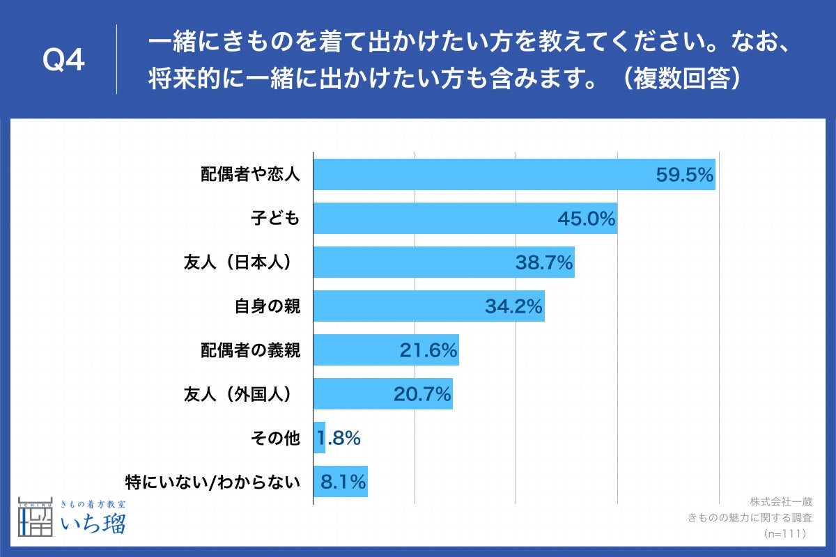 「Q4.一緒にきものを着て出かけたい方を教えてください。なお、将来的に一緒に出かけたい方も含みます。(複数回答)」と質問したところ、「配偶者や恋人」が59.5%、「子ども」が45.0%、「友人(日本人)」が38.7%という回答となりました。