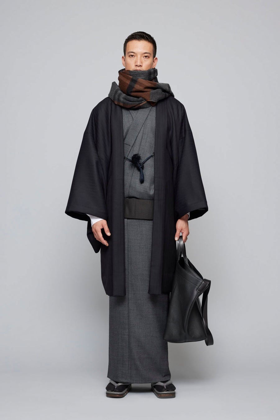 柄の一方は、ハウンドトゥースをモチーフとし、色はダークグレー。もう一方は ヘリンボーン柄でブラックに仕上げています。着物や羽織に仕立てる際は、表面にどちらを出すかお選びいただけます(※)。お客様のご寸法に合わせてマイサイズオーダーにてお仕立ていたします。(ご納期は寸法確定後約3週間)