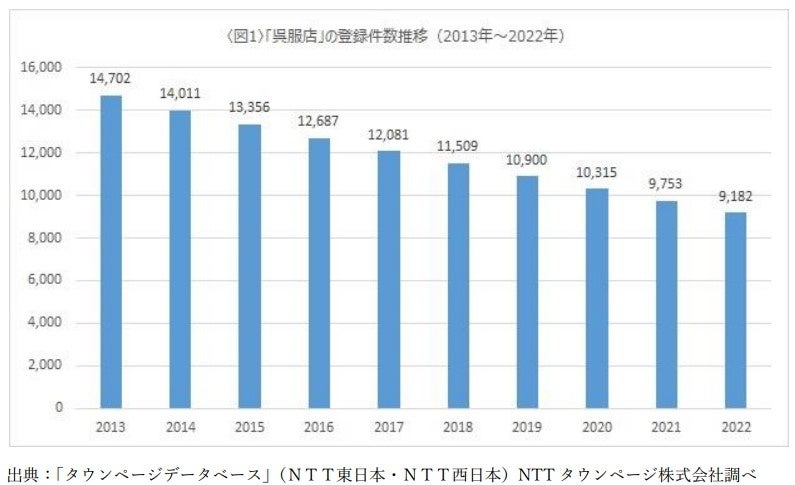 た。2020年のコロナウイルス感染拡大が発生後は、呉服店の登録件数は10,000件を割り、同じペースで現在も減少が続いています。