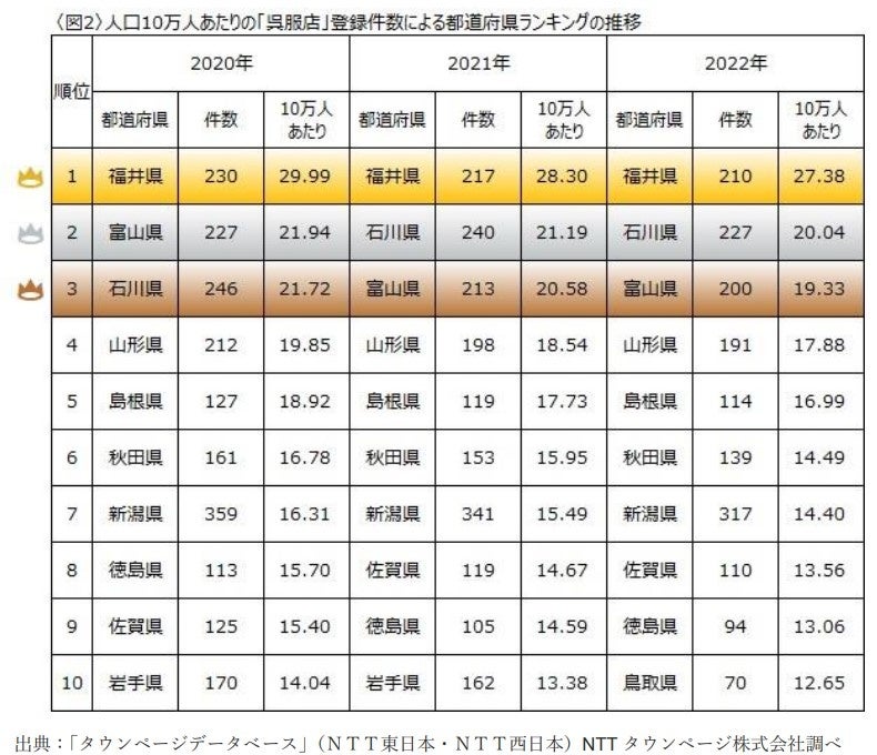 人口10万人あたりの呉服店の登録件数が多い地域は、1位が10万人あたり27.38件で福井県、2位が10万人あたり20.04件で石川県、3位が10万人あたり19.33件で富山県となり、TOP3はすべて北陸地方の県がランクインするという結果になりました。