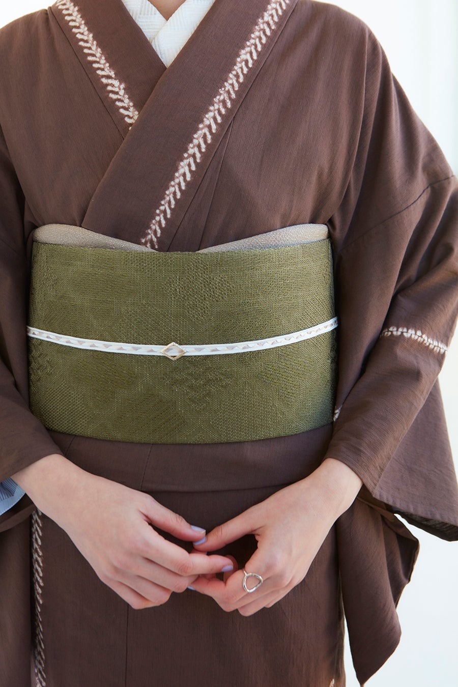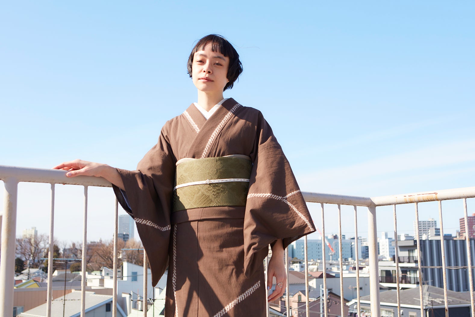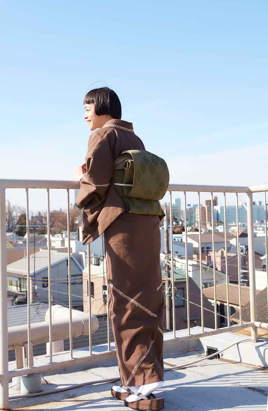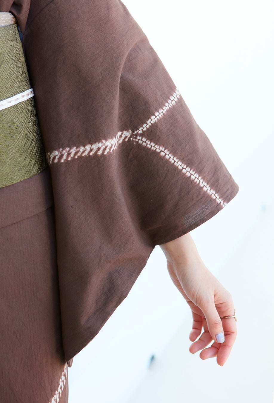 様々な技法により生まれる模様が独特の奥⾏きを感じさせる「有松鳴海絞り」と、着るほどにその良さが活きる「⽚⾙⽊綿」をかけ合わせ、着る⼈が主役の「絞り⽊綿きもの」をさんちの⽅と共につくりあげました。