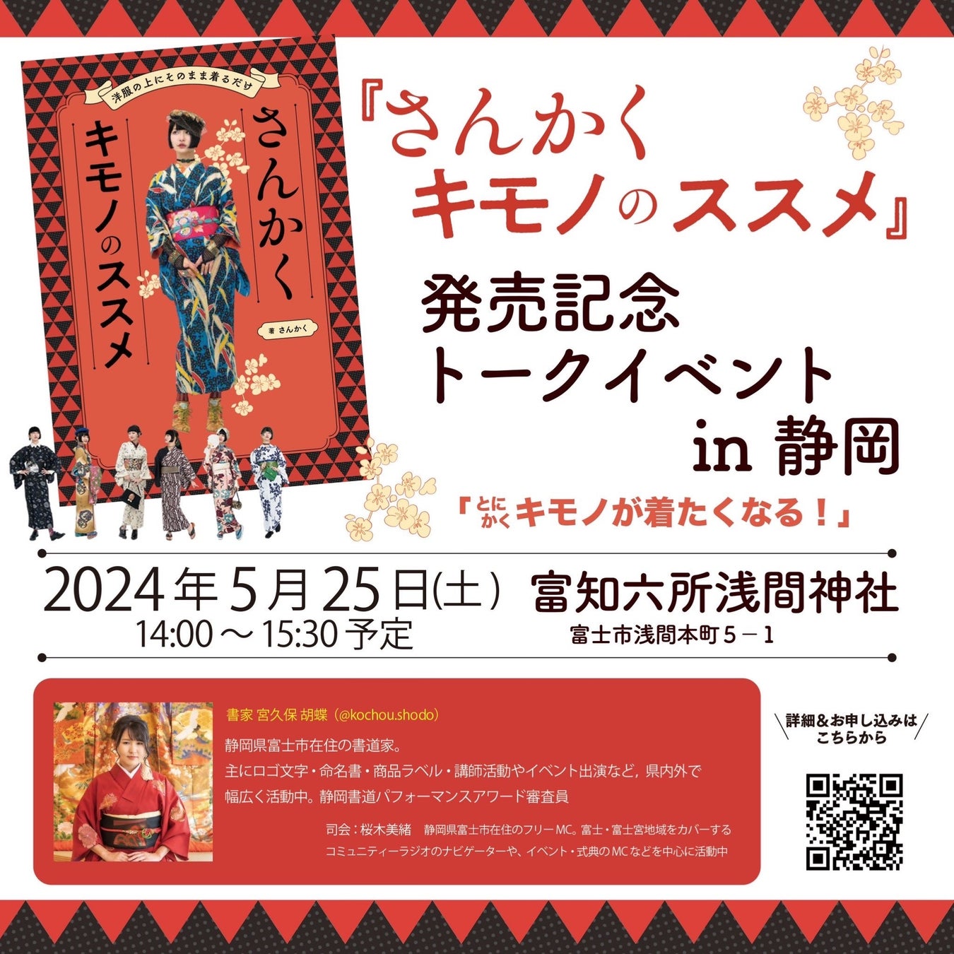 主催は静岡県富士市在住の書道家・宮久保胡蝶さん。日常に着物を取り入れるコツから、本書の解説や制作の裏側を根掘り葉掘り聞いていきます。(司会:桜木美緒)