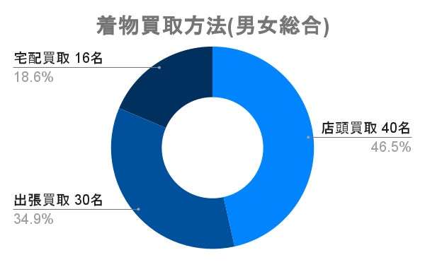 利用した着物買取方法「店頭買取」「出張買取」「宅配買取」の3種類のうち、利用した買取方法について伺ったところ、男女合わせて、店頭買取が約46.5%が最も多く、出張買取が34.9%、宅配買取18.6%でした。