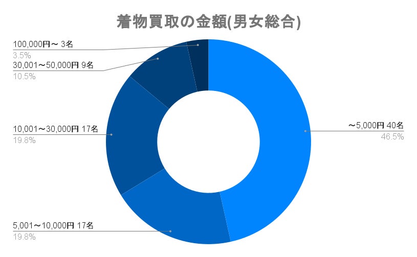 また、着物買取額についても調査したところ、合計1万円以上になったのは全体の約33.7%(男性:約34.6%、女性:約33.3%)でした。