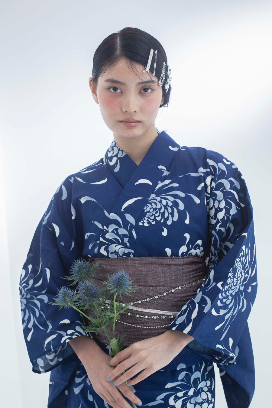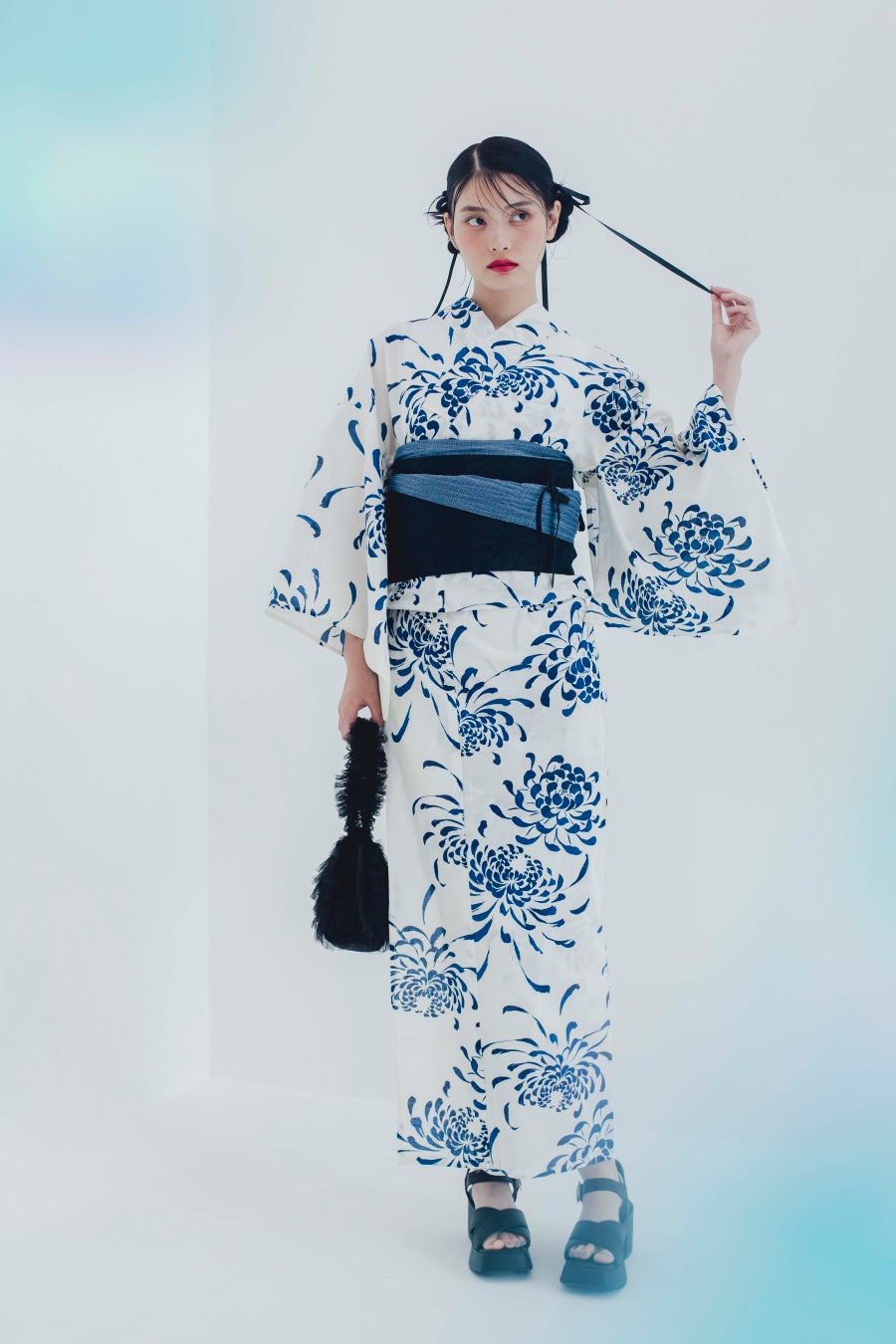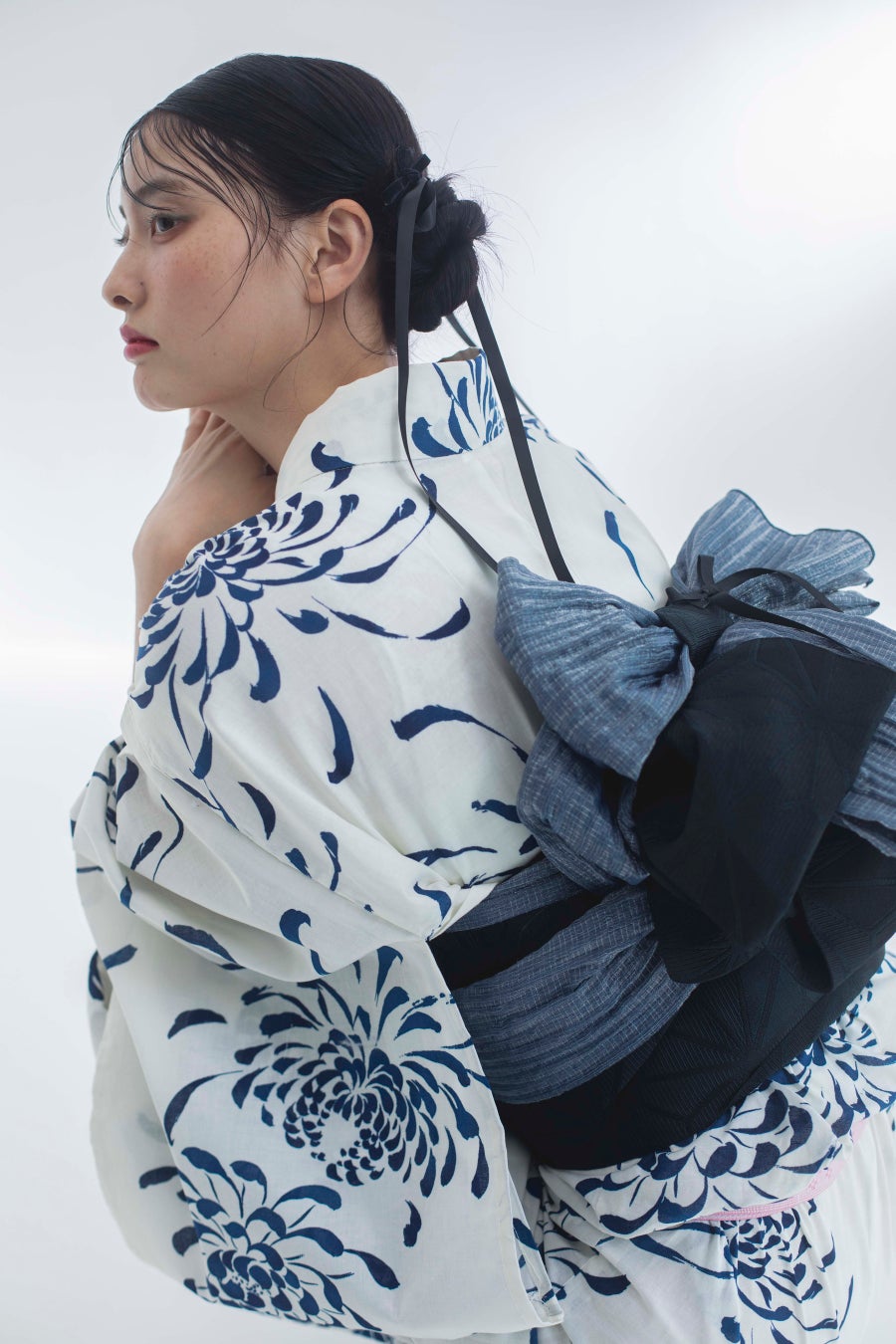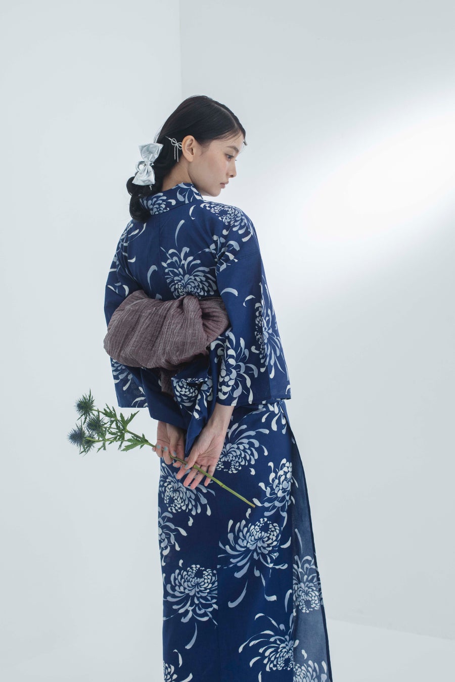 しっとり落ち着いたホワイト地にネイビーの菊が爽やかさと控えめで色っぽさを演出してくれます。