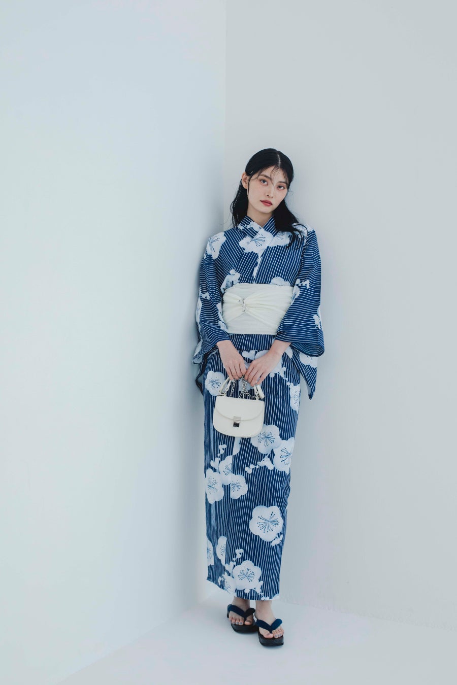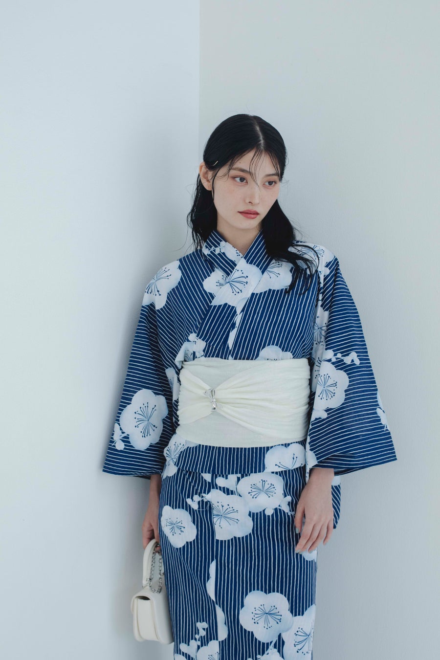 ネイビーにホワイトストライプ梅柄がモダンに、すっきりとバランスよく魅せてくれます。