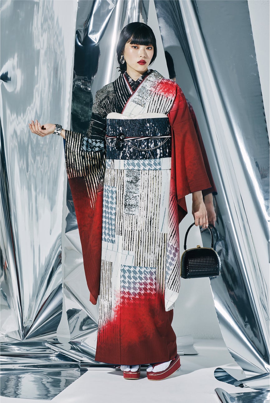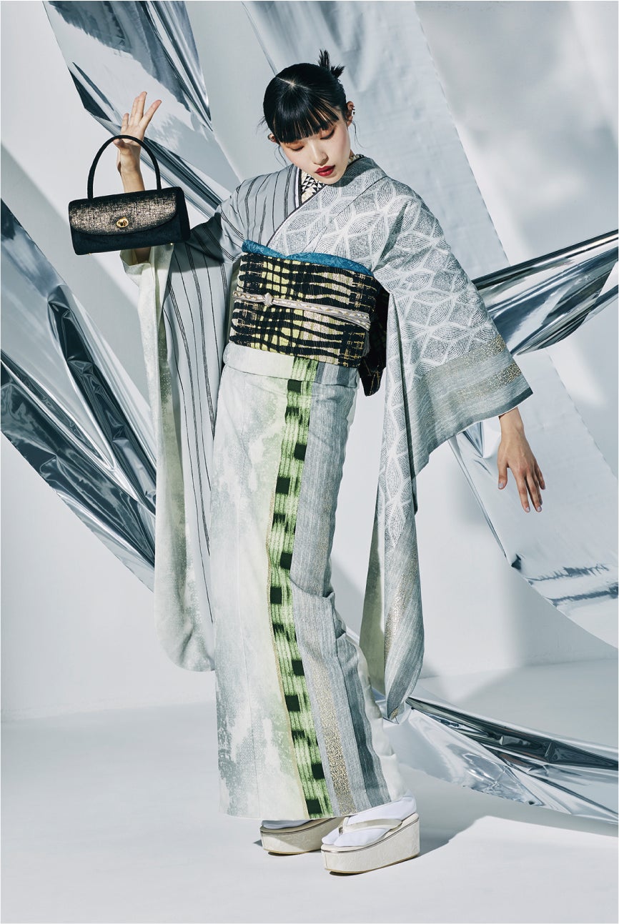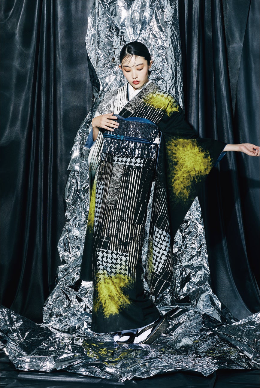 既存の概念にとらわれることなく、ブランドのテイストを着物に融合。幾何学模様やパッチワーク柄、