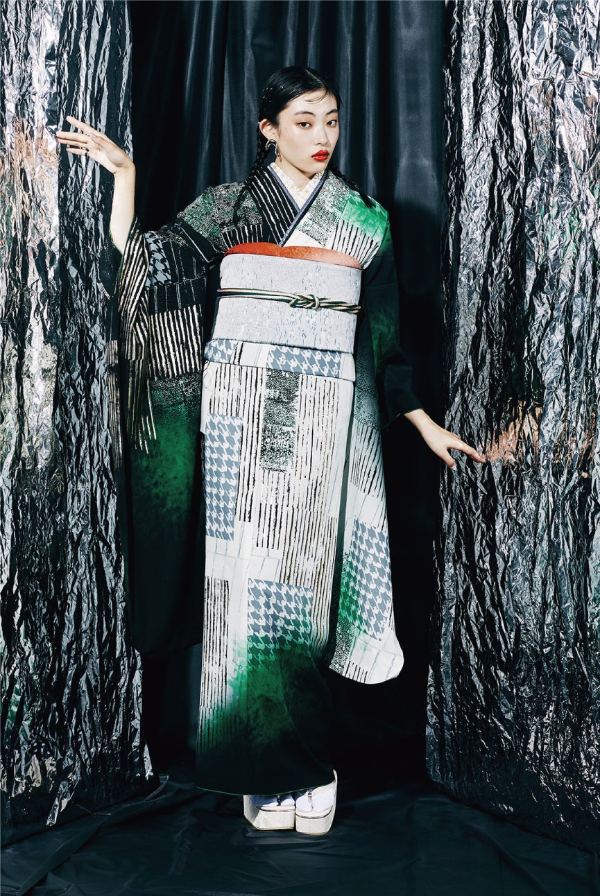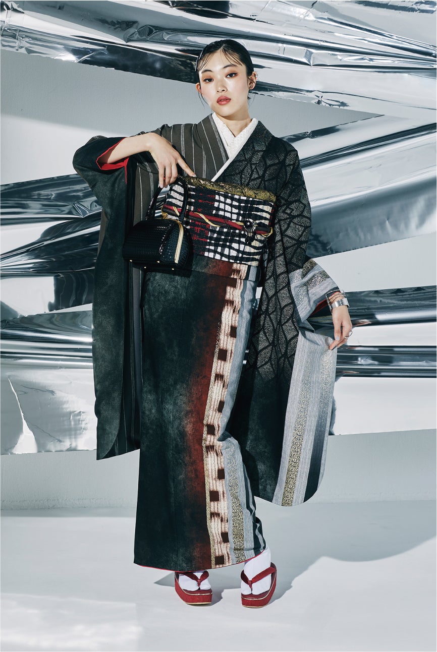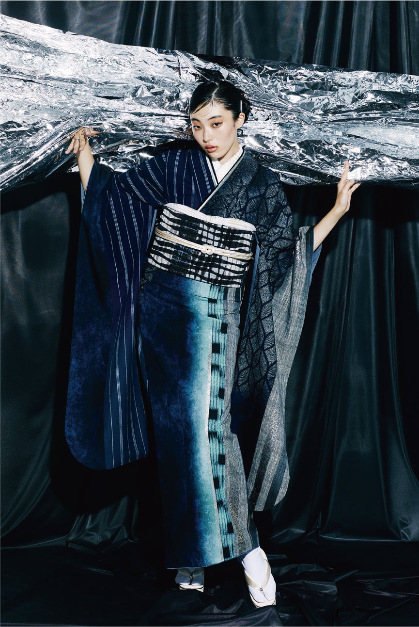 既存の概念にとらわれることなく、ブランドのテイストを着物に融合。幾何学模様やパッチワーク柄、