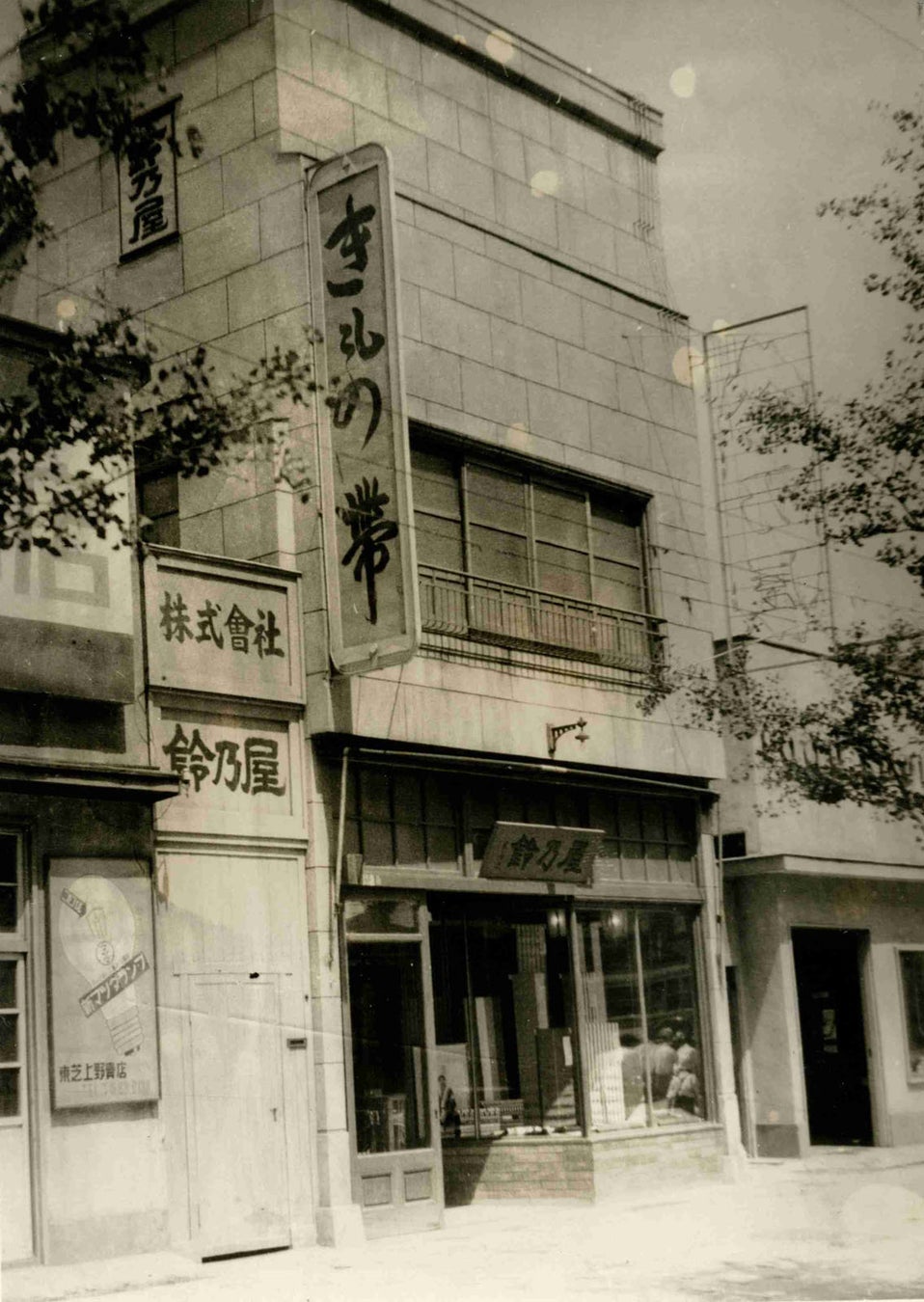 鈴乃屋は1947年9月28日に上野広小路で誕生しました。創業者小泉清子と一人の女性店員が働く、間口わずか二間の小さな店から始まりました。開店当初の店舗は15坪の2階建てで、2階の板壁には「きもの帯 鈴乃屋」の看板が掛けられていおり、ウィンドウには染め見本が5本陳列されていました。