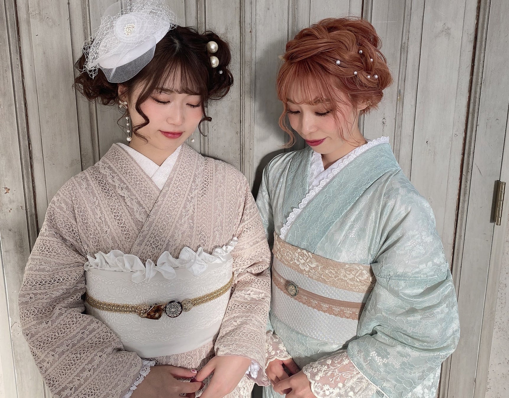 レースやブローチといった洋のアイテムを使用して、より現代的なお好みのコーディネートが可能になりました。レースの着物やアンティークの着物に合わせて自分だけのコーディネートができる人気のプランです。