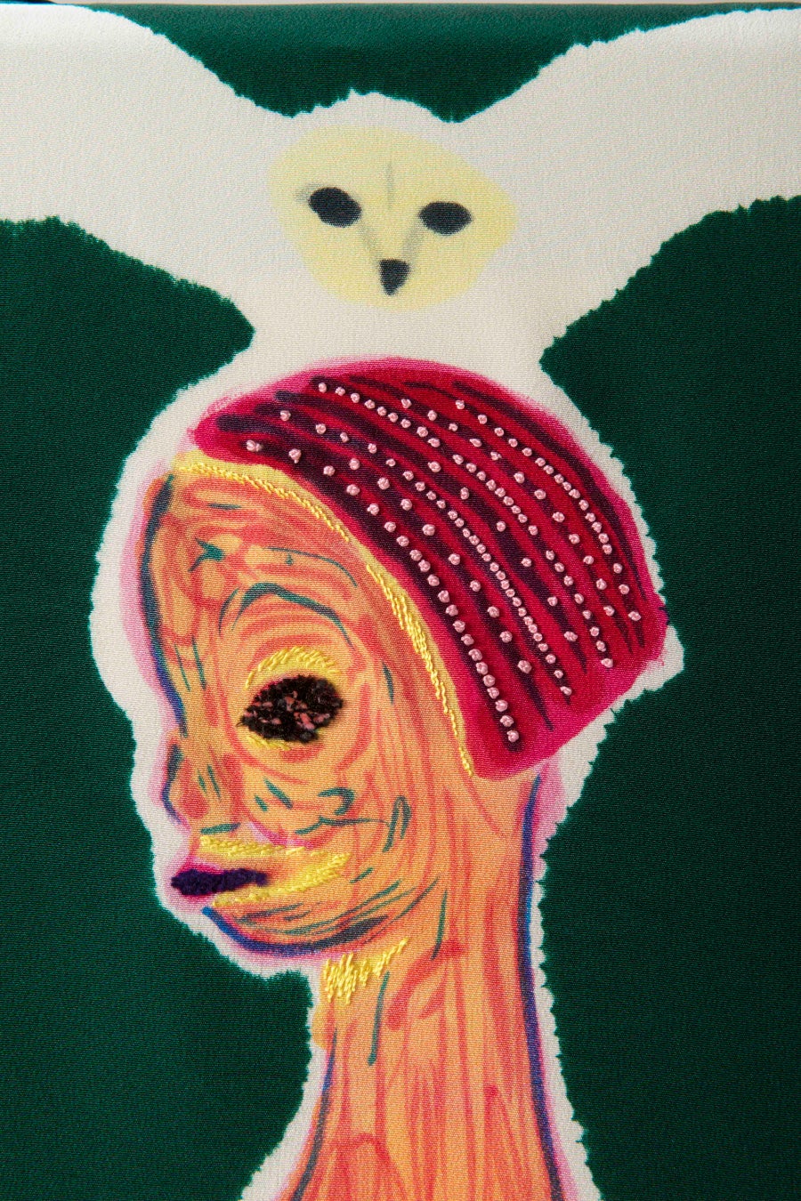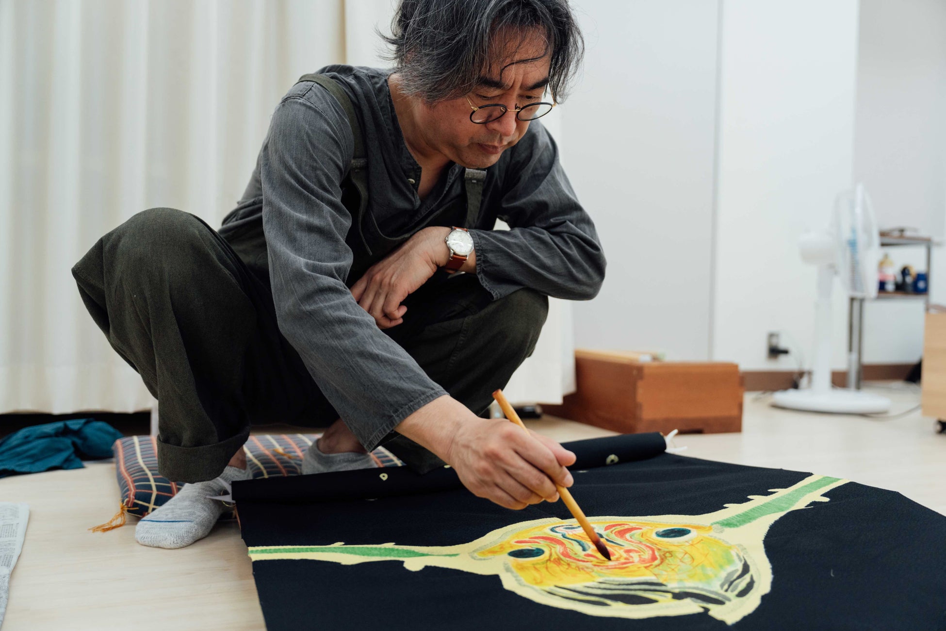 制作は千總本社内にある工房のほか、京都府内にあるそれぞれの専門工房で行われました。加藤自身、何度も京都を訪れ、特に「人型(ひとがた)」と称される彼特有のモチーフは、自ら筆をとり、職人たちと肩を並べながら伝統的な友禅の技法によって描きました。長年にわたる千總の歴史の中でも、友禅職人以外の手によって着物生地に染色が加えられるのは極めて珍しいことです。