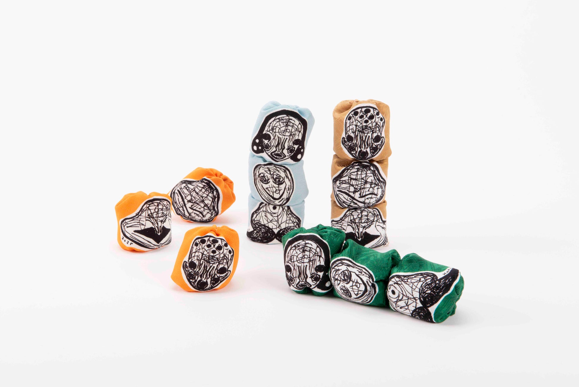 加藤泉によるドローイングをデザインに取り入れた展覧会特製のグッズを制作しました。品質基準を僅かでも満たすことができず着物にはならなかった生地を使った「おじゃみ(お手玉)」(4種類、3個セット)、伝統的な製法で作られた団扇(2種類、スタンド付き)数量限定にて販売します。