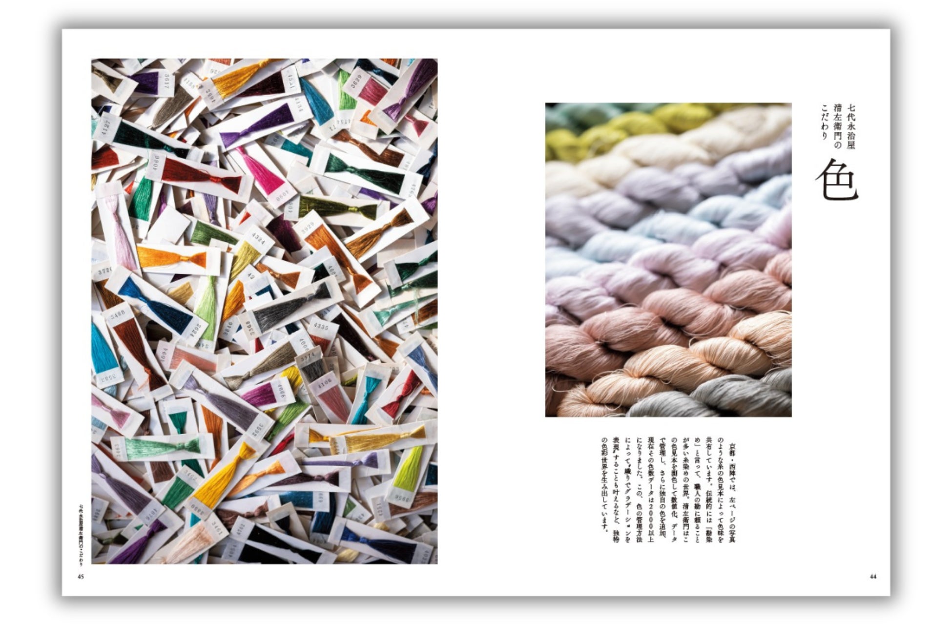 唐織や二重織など、織の最高峰を極め続けるブランドの真髄がこの一冊に凝縮されています。織技法では困難とされた総絵羽の柄取りで、京都の四季の風景が絵のように連続する「四季連作」や、小袖コレクションとその復元制作など、永治屋清左衛門の挑戦が、今、花開きます。