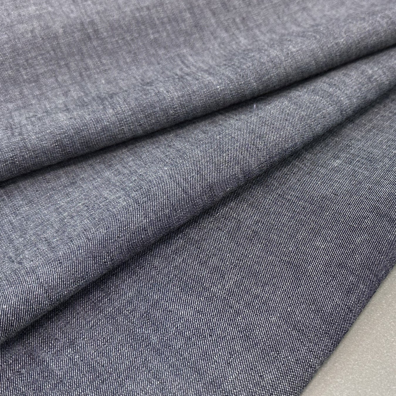 cotton100%の平織り生地。デニムは本来は綾織りですが、糸の風合いを活かすために平織りで織られています。繊維が長い事から細番手の糸で織る事が可能。デニム特有のごわつきもなく軽さと強度に加えしなやかな光沢が深みを出し、made in Japanの確かな技術は正絹紬のような風合いを感じさせてくれます