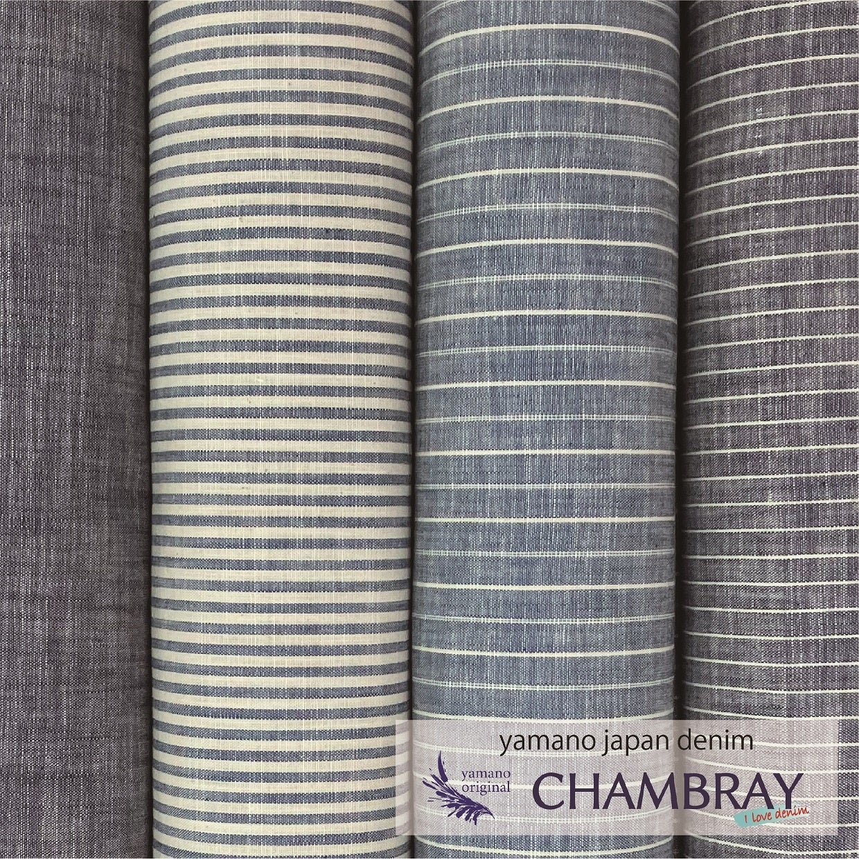 シャンブレーは坂本デニム社のストレッチデニムの糸を平織りにしたcotton100%の生地。デニム本来の風合いを残しつつライトオンス(薄めの生地)で平織りで織りあげている為、ストレッチデニムより薄く軽やかな素材で、単衣・夏向きの生地と言えます。