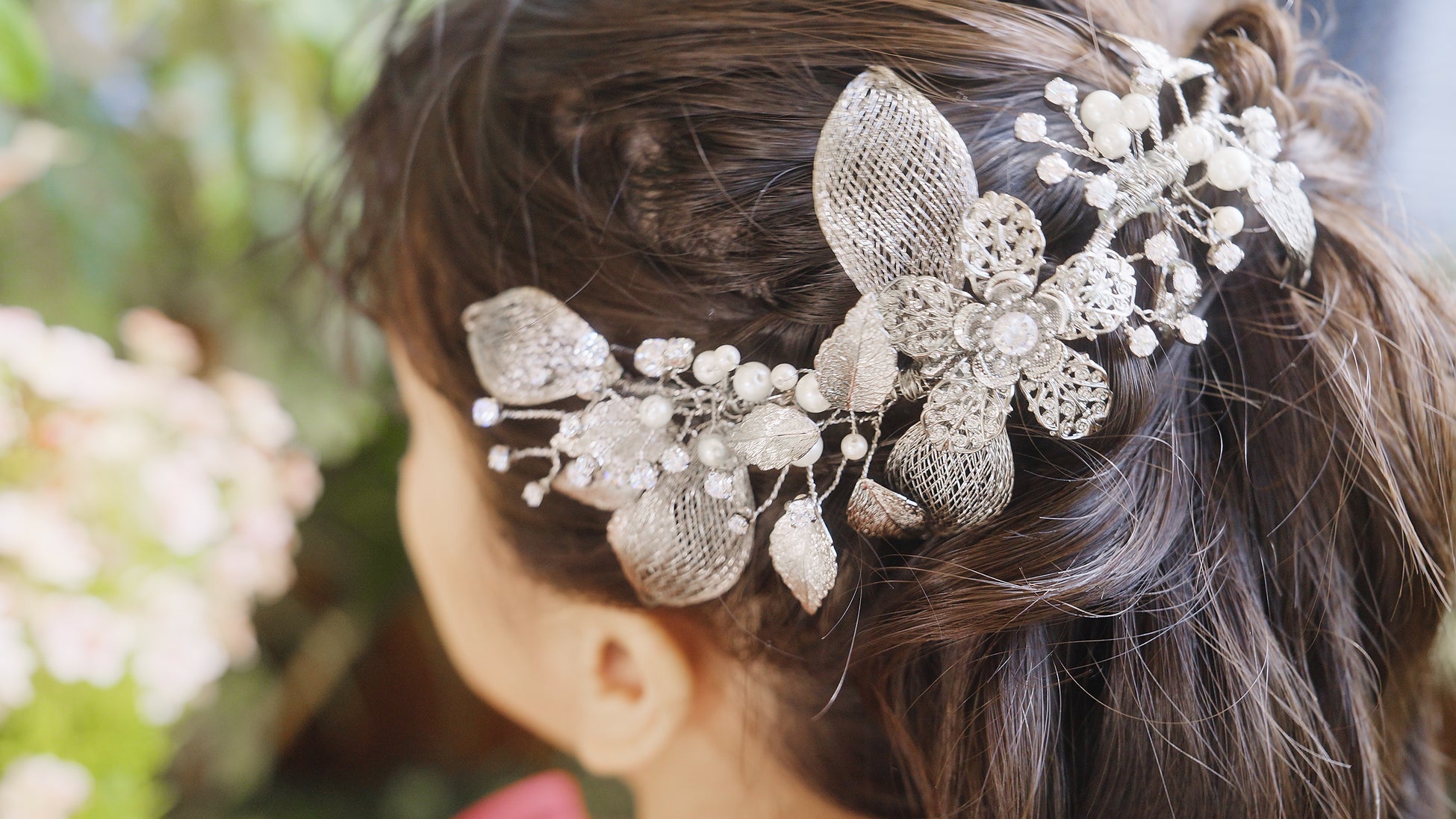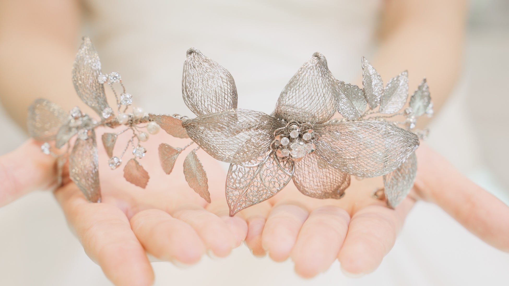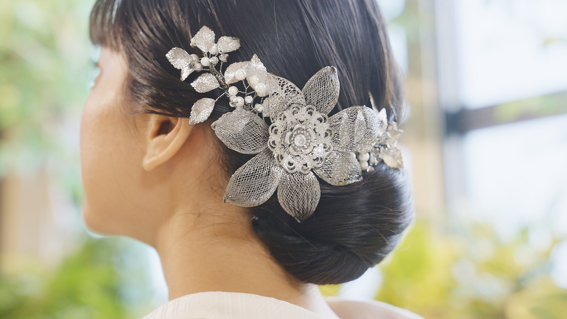 葉の一枚一枚を、特殊な金属糸で編み込むなど、ヘアアレンジしやすい軽量化と可動性を実現。
