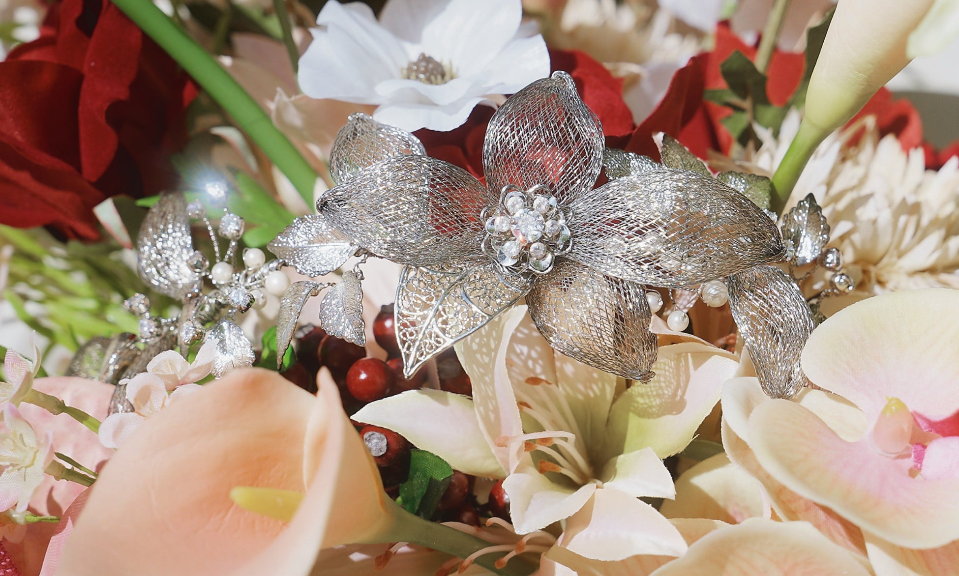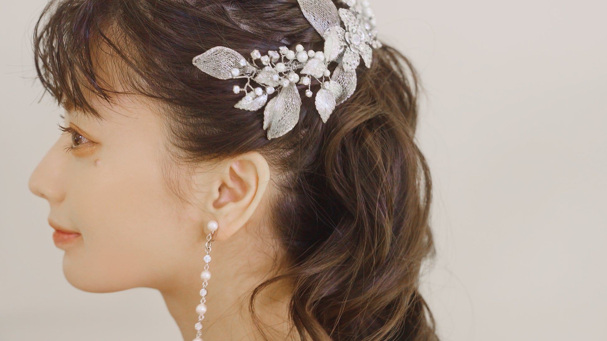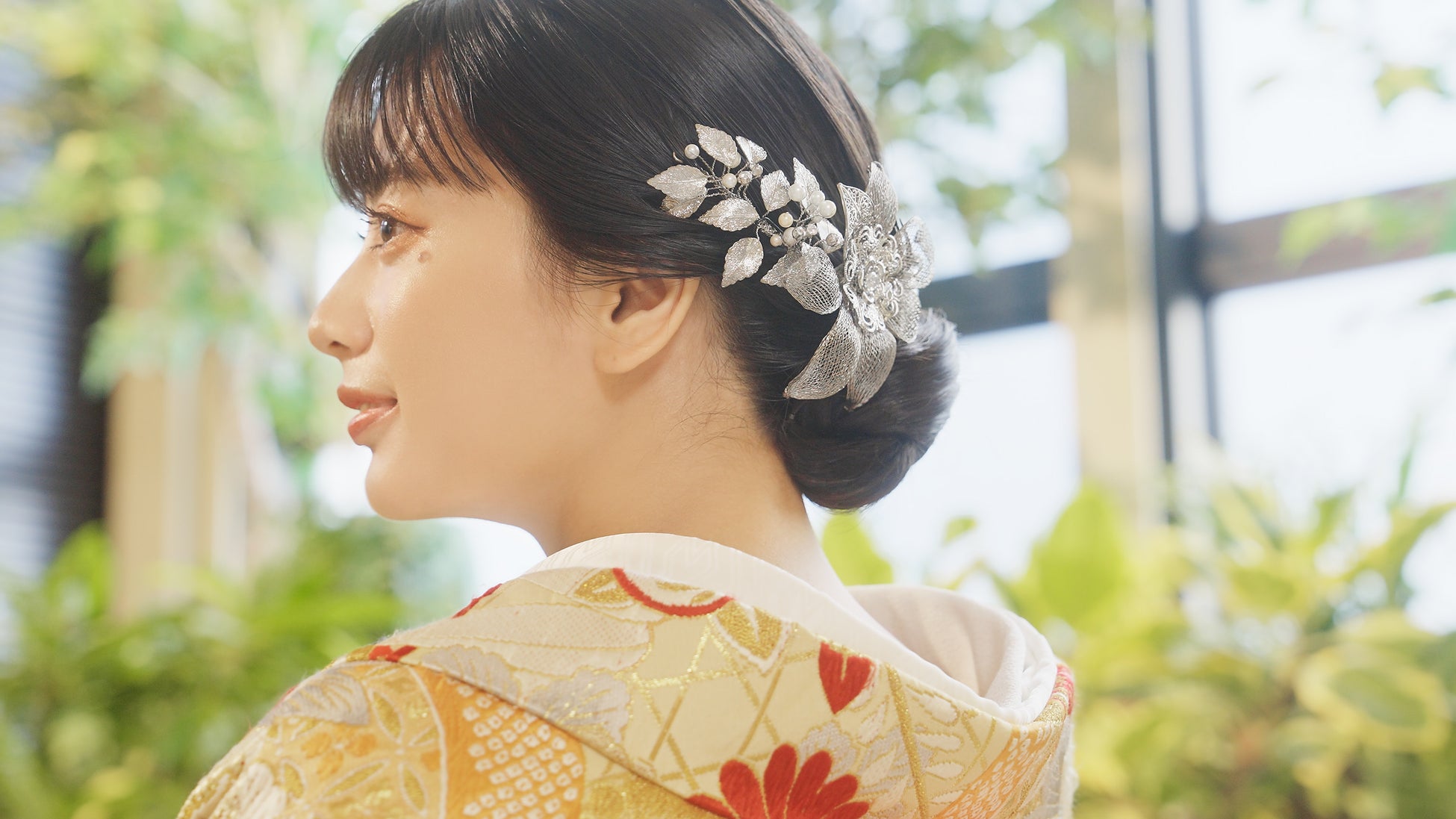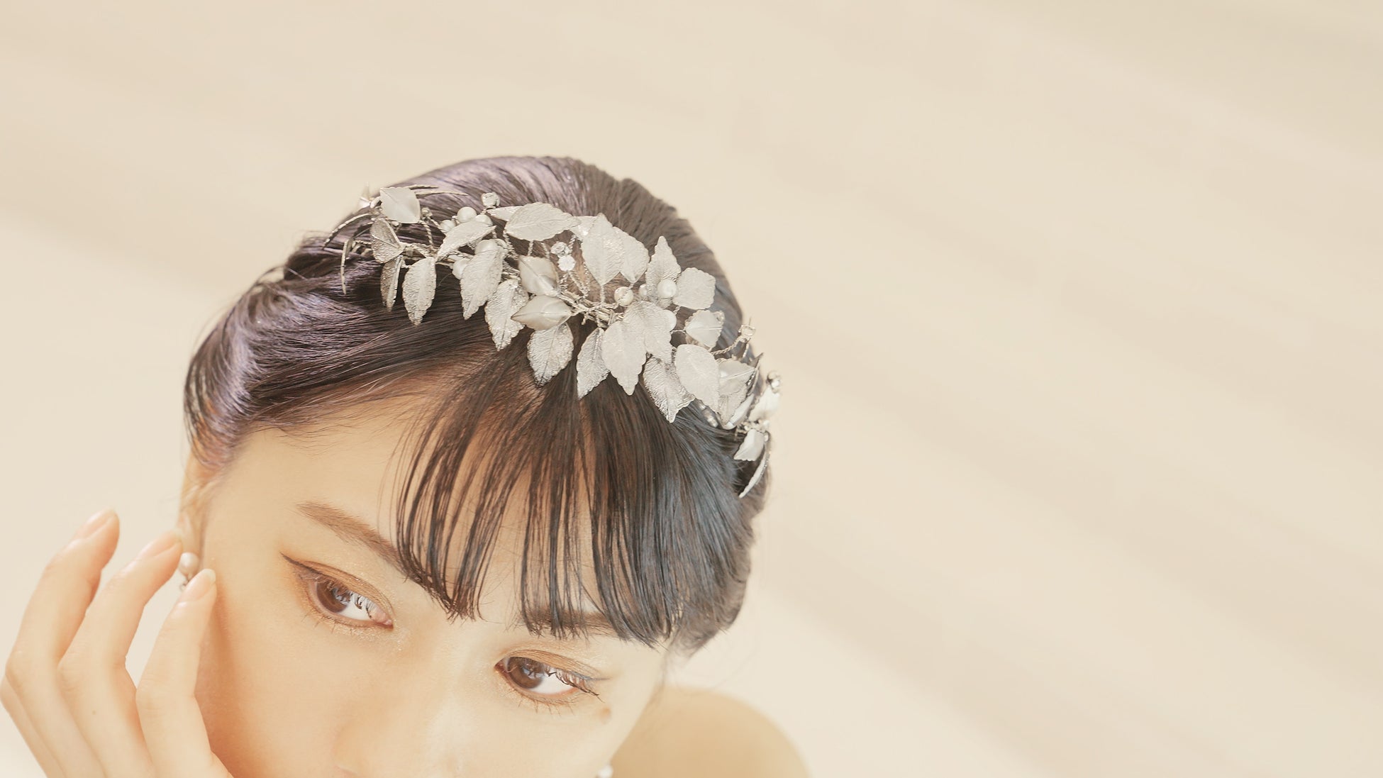 葉の一枚一枚を、特殊な金属糸で編み込むなど、ヘアアレンジしやすい軽量化と可動性を実現。